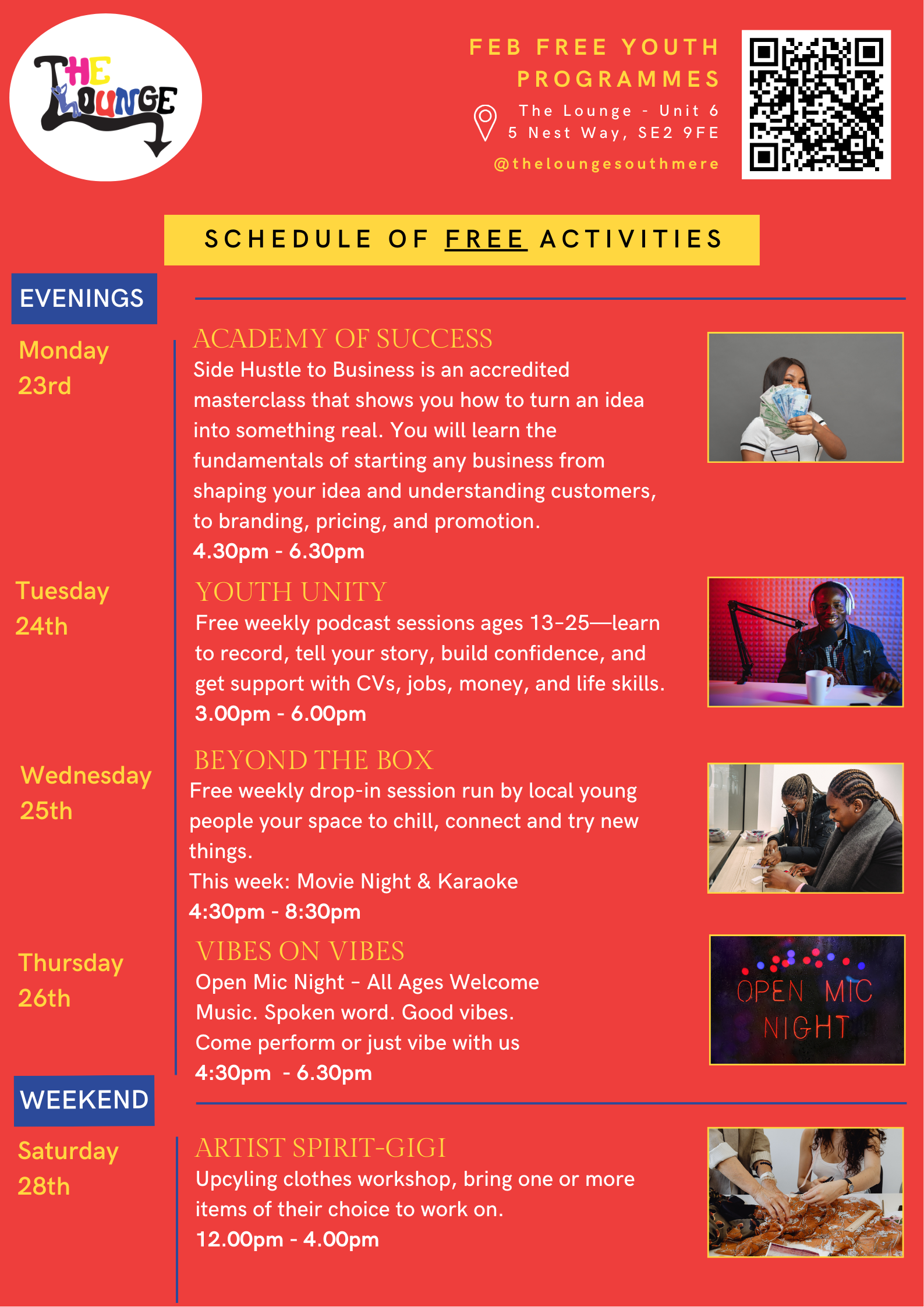 This is your place to chill, connect and try new things. From creative sessions and workshops to drop-ins, and industry events, The Lounge is all about good energy, real people and opportunities that matter to you.